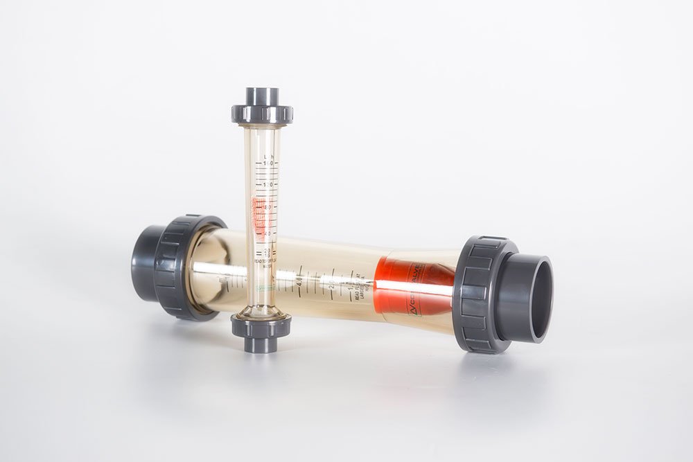 CVAF series flowmeters operates according to the proven variable area principle. The float gets lifted by the flowing medium and indicates the flow with its upper edge on the scale attached to the device. If floats with integrated magnets are used, optionally, alarm contacts or a measuring transmitter can be attached to the device. All devices possess a male thread on the measuring tube and are additionally equipped with standard PVC adhesive sleeves. As an option, also female threaded fittings made of PVC, PP, ABS or stainless steel can be supplied.